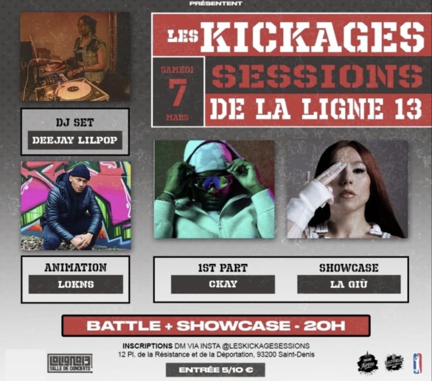Prochain évènement : le samedi 7 mars pour les Kickages Sessions X @rappeuz à la ligne 13 @salledeconcertsligne13 !